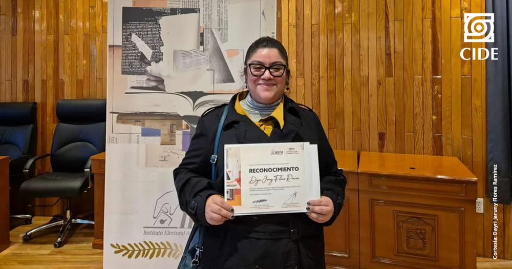 Ciudad de México, 21 de noviembre de 2025. Dayri Jaruny Flores Ramírez, estudiante del séptimo semestre del Doctorado en Ciencia Política del Centro de Investigación y Docencia Económicas (CIDE), obtuvo el primer lugar del XXVIII Certamen de Investigación y Ensayo Político del Instituto Electoral del Estado de México (IEEM).